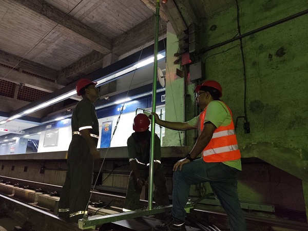 Durante las labores efectuadas por personal experto de la casa ferroviaria y comprometida con el funcionamiento óptimo del sistema, ejecutó medición de altura y centralización de la catenaria de la línea comercial, para el buen funcionamiento del suministro de energía.